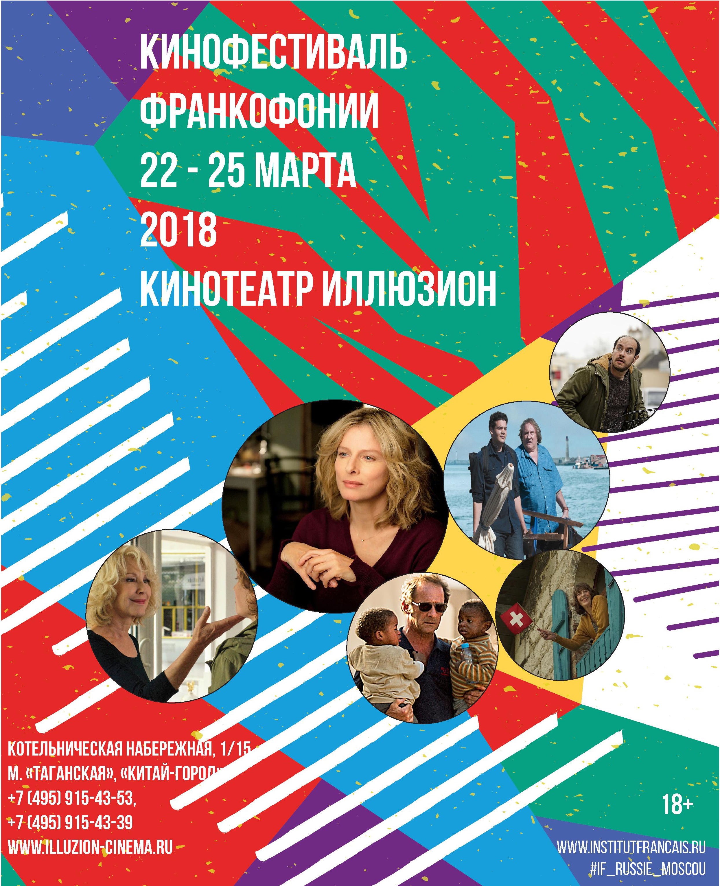 С 22 по 25 марта в московском кинотеатре «Иллюзион» в рамках «Дней франкофонии» пройдет Кинофестиваль франкофонии. Зрителям будут представлены семь кинолент из Франции, Швейцарии, Бельгии и Румынии, а также программа анимационных фильмов из Канады.