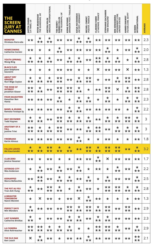 27 мая, в день закрытия 76 Каннского международного кинофестиваля, журнал Screen традиционно представил финальный рейтинг фильмов основного конкурса. Рейтинг каждой ленты складывается из оценок 11 международных критиков, представляющих издания разных стран, а также оценки самого Screen.