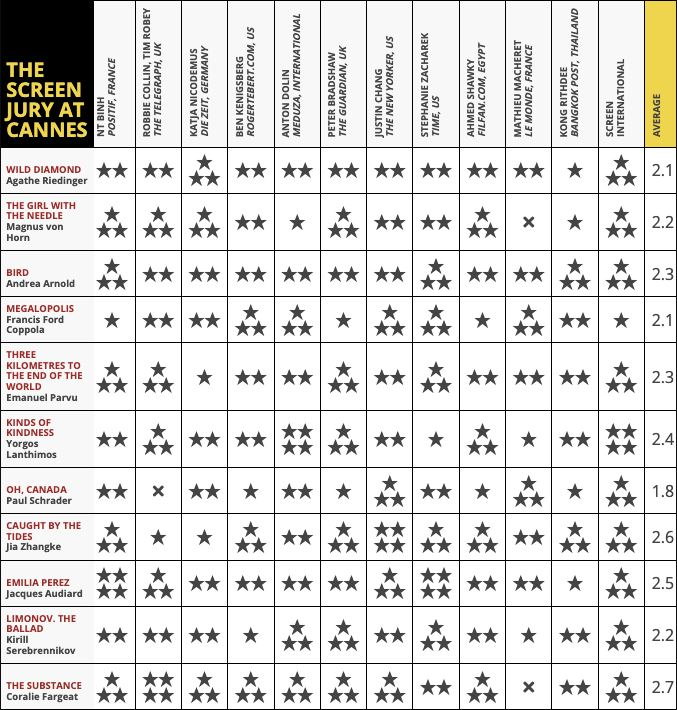 20 мая журнал Screen традиционно представил промежуточный рейтинг фильмов основного конкурса 77 Каннского международного кинофестиваля. В него вошло 11 из 22 картин. Оставшиеся 11 лент покажут в предстоящие дни киносмотра. Рейтинг каждого фильма складывается из оценок 11 международных критиков, представляющих издания разных стран, а также оценки самого Screen.