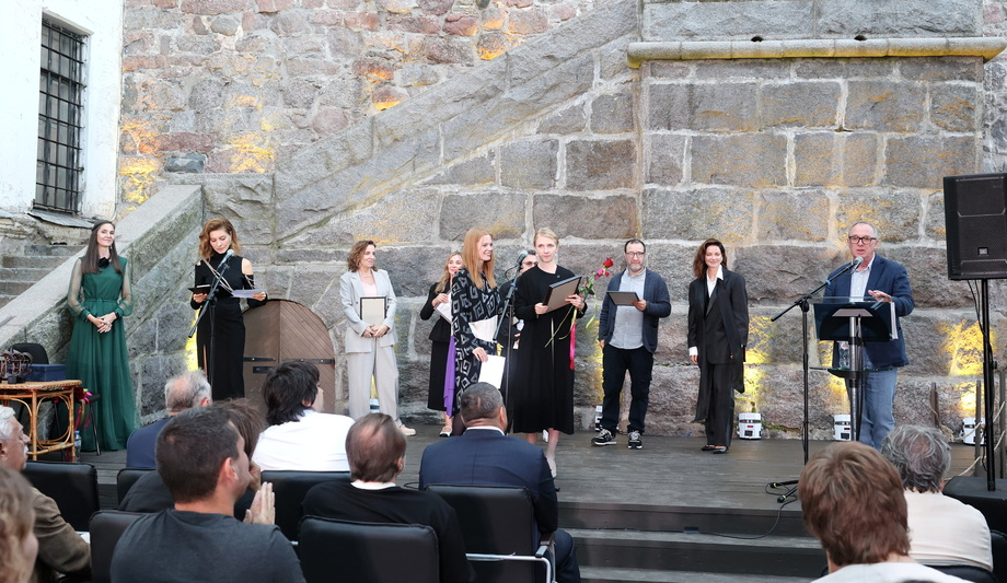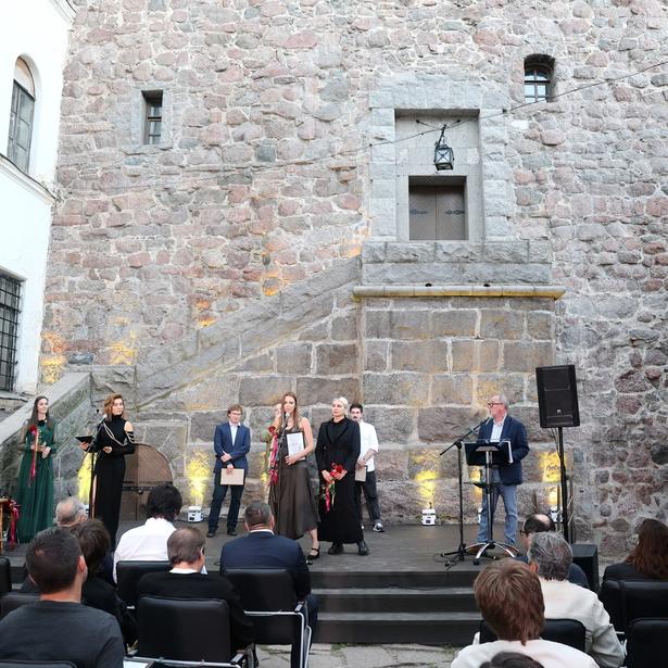 Во время церемонии награждения участники смотра собрались во внутреннем дворике средневекового замка. Гостей на сцене поприветствовали президент фестиваля Сергей Урсуляк и актриса Елена Подкаминская.