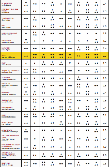 Лидером таблицы с 3,3 баллами из 4 возможных осталась историческая драма «Роза» / «Rose» Маркуса Шляйнцера, которая по итогам киносмотра выиграла награду за Лучшую главную роль (Сандра Хюллер).