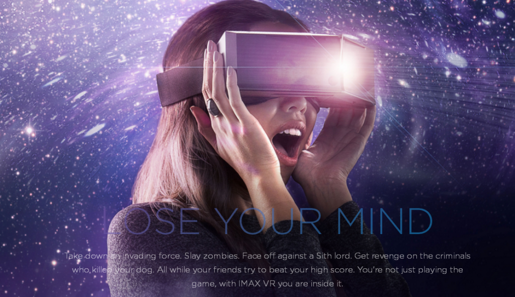 IMAX VR – новое направление работы корпорации IMAX. В его основе — самые передовые мировые разработки в области виртуальной реальности, которые позволяют пользователям полностью погрузиться в интерактивные приключения, благодаря новейшим премиальным технологиям в области видео и звука получить новые ощущения и впечатления, сравнимые с впечатлениями от посещения кинотеатров IMAX. Благодаря модульному дизайну, разработанному специалистами IMAX, в VR-проектах может быть задействовано одновременно несколько пользователей.