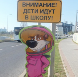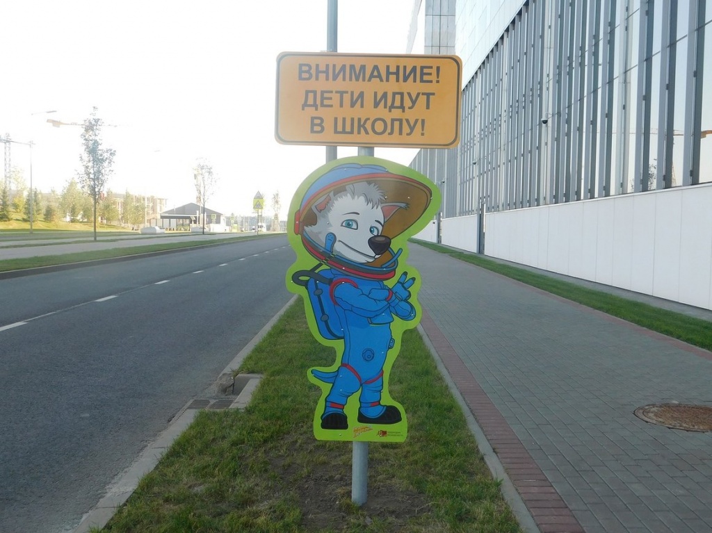 Яркие фигурки Белки и Стрелки не только украшают современную городскую среду, но призывают водителей к особенной осторожности вблизи образовательного учреждения: «Внимание! Дети идут в школу!», - гласит табличка на стендах.
