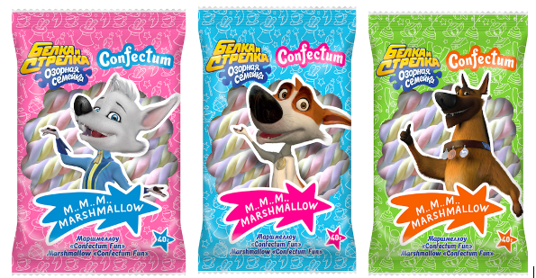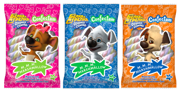 В начале февраля в продажу поступит маршмеллоу «Confectum Fun», на упаковках которого изображены герои анимационного сериала «Белка и Стрелка. Озорная семейка» студии КиноАтис, выпускающей эти товары для детей совместно с компанией Конфектум — самым известным производителем маршмеллоу в России и странах СНГ.