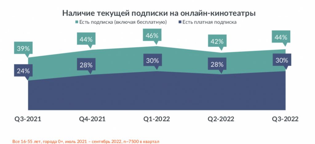 26 октября компания GfK поделилась результатами регулярного исследования рынка онлайн-кинотеров за третий квартал 2022 года. Согласно отчету GfK, за данный период доля подписчиков онлайн-кинотеатров выросла после снижения во втором квартале. Так, подписка была оформлена у 44% горожан, платная подписка – у 30%.