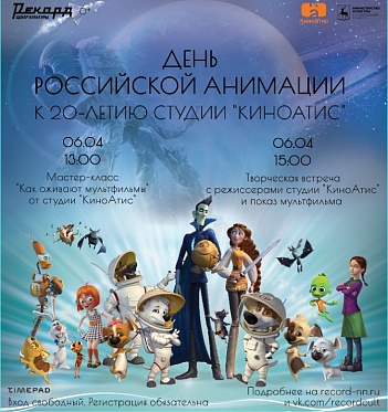 6 апреля в Нижнем Новгороде, в Центре культуры Рекорд, пройдет день российской анимации, приуроченный к 20-летию студии КиноАтис. В рамках мероприятия запланированы мастер-класс «Как оживают мультфильмы», показ полнометражного анимационного фильма «Белка и Стрелка. Карибская тайна» и творческая встреча с режиссерами студии Инной Евланниковой и Сергеем Антоновым.