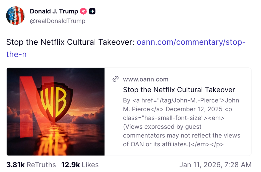 11 января президент США Дональд Трамп в своей социальной сети Truth Social опубликовал статью политического телеканала One America News, осуждающую $83-миллиардную покупку Netflix компании Warner Bros. Discovery. Об этом пишет Deadline. Напомним, о продаже WBD стриминговому гиганту стало известно в начале декабря.