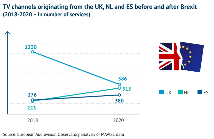 Несмотря на резкое сокращение более чем на 50% количества британских телеканалов в 2018-2020 гг., Великобритания оставалась самым крупным поставщиком ТВ в Европе, предоставляя 586 телевизионных услуг. Треть сервисов до и после Brexit мигрировали из Великобритании в Нидерланды (18%) и Испанию (14%). В то же время страна больше не является хабом номер один для телеканалов, нацеленных на невнутренние рынки, теперь она по этому показателю занимает второе место после Нидерландов, но по-прежнему опережает Испанию. Четверть (24%) всех телеканалов и более половины (53%) всех платных услуг по запросу из Европы были нацелены на зарубежные рынки. Великобритания, в которой в 2020 году было 106 платных услуг по запросу, ориентированных на другие рынки, также уступила первое место Ирландии, которая насчитывает 180 таких сервисов.