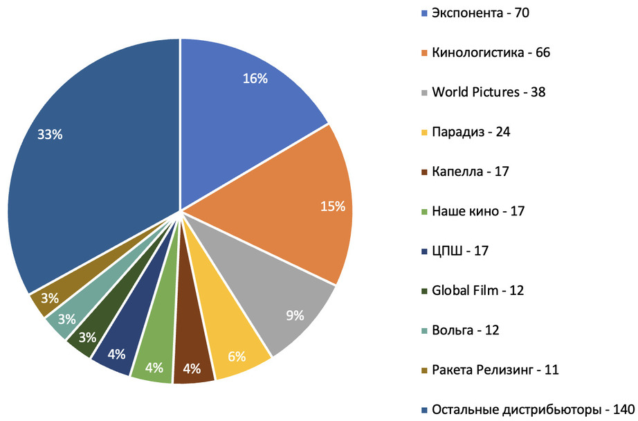 С 1 января 2019 года по 30 сентября 2024 года в отечественный прокат было выпущено около 424 хорроров, лишь 24 из которых российского производства. Лидерами по релизам стали дистрибьюторы Экспонента и Кинологистика, выпустив 70 и 66 проектов соответственно, но ни один из их фильмов не смог преодолеть порог в 100 млн рублей. Самым кассовым хоррором у Экспоненты стал «Заклятье. Дом 32» (98 млн рублей), а у Кинологистики — «Челюсти. Столкновение» (53 млн рублей). В среднем каждый из этих дистрибьюторов выпускал ежегодно по 11 хорроров.