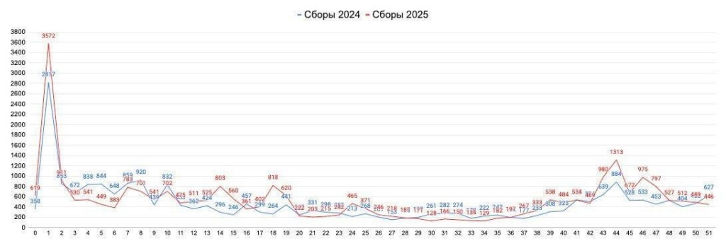 С 26 декабря 2024 года по 25 декабря 2025 года в отечественный прокат вышло 599 российских и зарубежных фильмов без учета сборников короткометражных лент, балетных и театральных постановок, концертов, опер, а также картин прошлых лет. Их общая касса по состоянию на 25 декабря 2025 года составила 39,4 млрд рублей. Вместе с альтернативным контентом (спектаклями, концертами, спортивными трансляциями и т.п. на большом экране) сборы от легальных показов можно оценить в 47,4 млрд. Финальные сборы российского кинопоказа с учетом теневого сегмента (неофициального показа голливудских блокбастеров) составили порядка 51 млрд рублей.