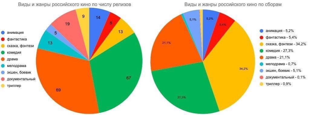 Жанры российского кино — доли по числу релизов и по сумме сборов