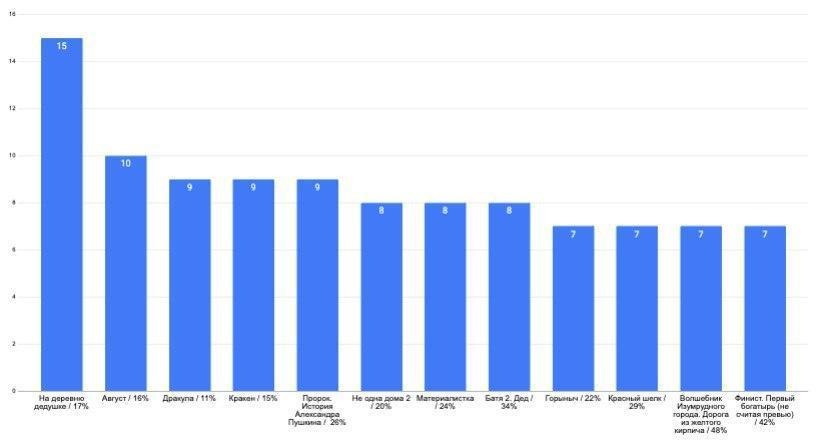 Как и в прошлом году, самое диспропорциональное отношение между количеством релизов и долей сборов — у сказок и фэнтези. Их выходит немного, но собирают они наибольшую долю бокс-офиса. Это не удивительно, если учесть, что один только «Волшебник Изумрудного города» заработал 12% от общей кассы всего отечественного кино.