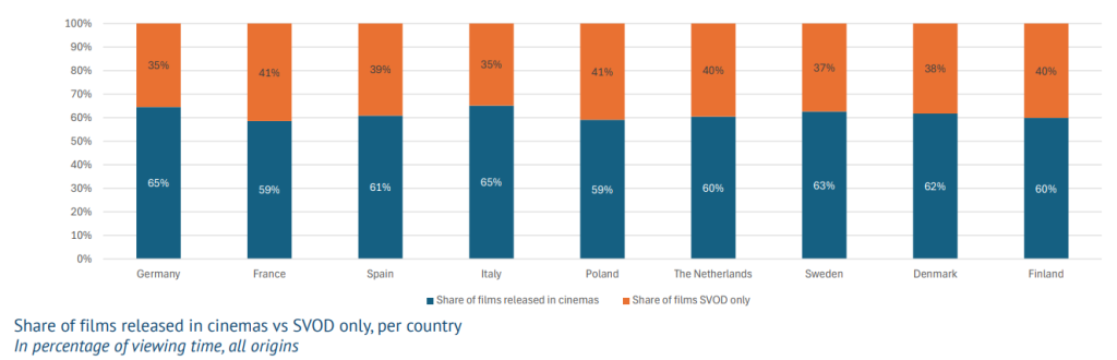 - Германия, Швеция, Дания и Финляндия — страны, где фильмы, выпущенные в кинотеатрах, показали лучшие результаты по просмотрам по сравнению с их долей представленности в каталогах.