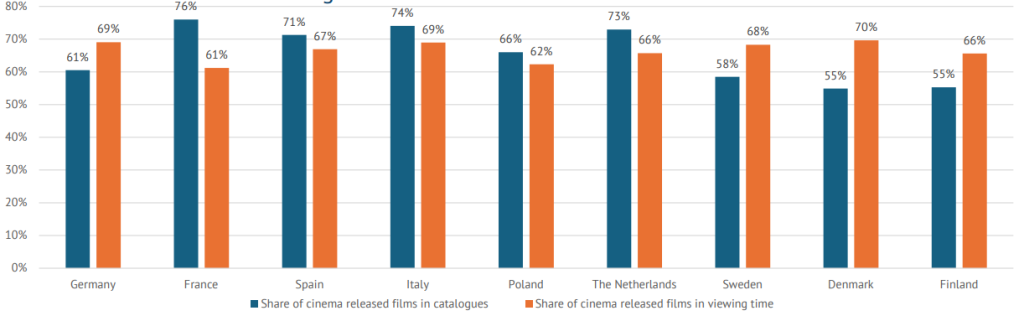Согласно исследованию, фильмы, вышедшие в кинотеатральный прокат как минимум в одной стране ЕС, имеют большую долю просмотров на стримингах, чем доля их представленности в каталогах онлайн-платформ. На их долю приходится почти две трети времени общего просмотра, несмотря на то, что они представляют чуть менее половины каталогов стримингов. Кинотеатральные релизы в странах Северной Европы показывают лучшие результаты по просмотрам, чем их доля представленности в библиотеках сервисов.