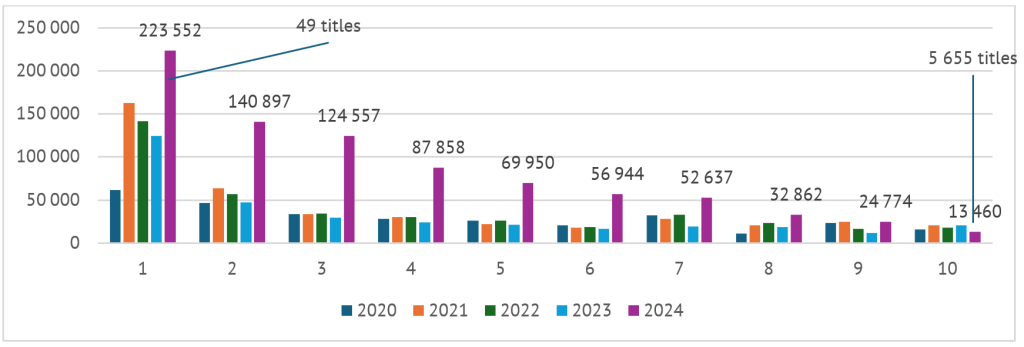 Если рассматривать каждый фильм отдельно, независимо от страны производства, то большинство из 100 самых популярных фильмов по количеству проданных билетов в кино в период с 2019 по 2023 годы были доступны на основных стриминговых платформах, при этом 96% из них были доступны онлайн. Однако лишь немногие из них добились сопоставимого успеха. Только 12 фильмов вошли в топ-100 по просмотрам, и все они были американскими.
