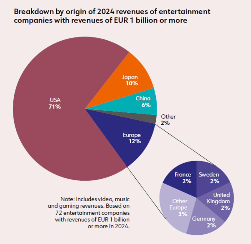 Также Европейская аудиовизуальная обсерватория обнаружила, что европейские компании, несмотря на процветающую внутреннюю индустрию, занимают всего 12% доходов международного сектора развлечений, что значительно меньше, чем у США, которые доминируют на мировом рынке.