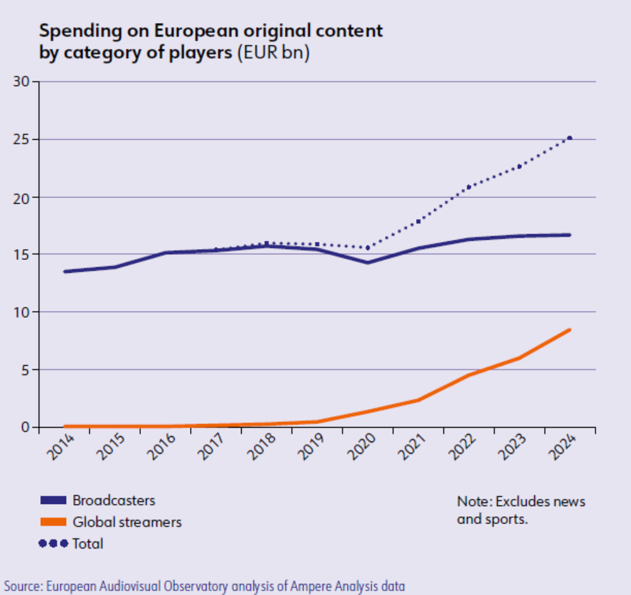 Стриминговые сервисы всё больше инвестируют в европейский контент. Глобальные стриминговые платформы увеличили свою долю расходов на оригинальные европейские проекты с 8% в 2020 году до 24% в 2024, что, как сообщается в отчете, отражает растущий спрос на европейский контент на мировых рынках.