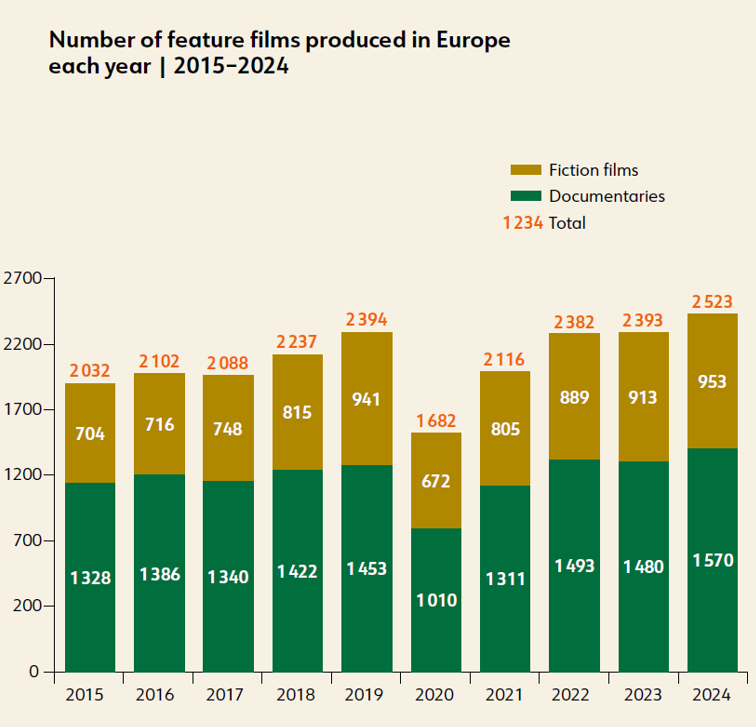 В 2024 году европейское кинопроизводство достигло рекордного пика — было произведено 2523 полнометражных фильма на 36 рынках, что, согласно отчету, подтверждает уверенное восстановление индустрии после пандемии. Рост аудиовизуального сектора был обусловлен как игровыми, так и документальными фильмами, при этом их производственные бюджеты продолжали увеличиваться во многих странах Европы.
