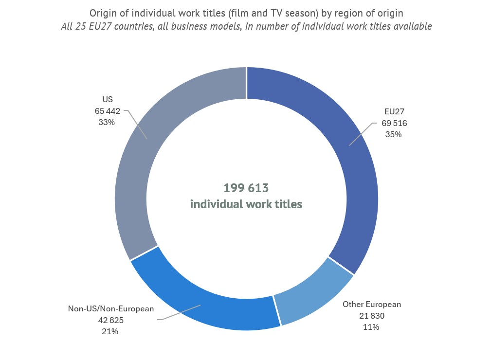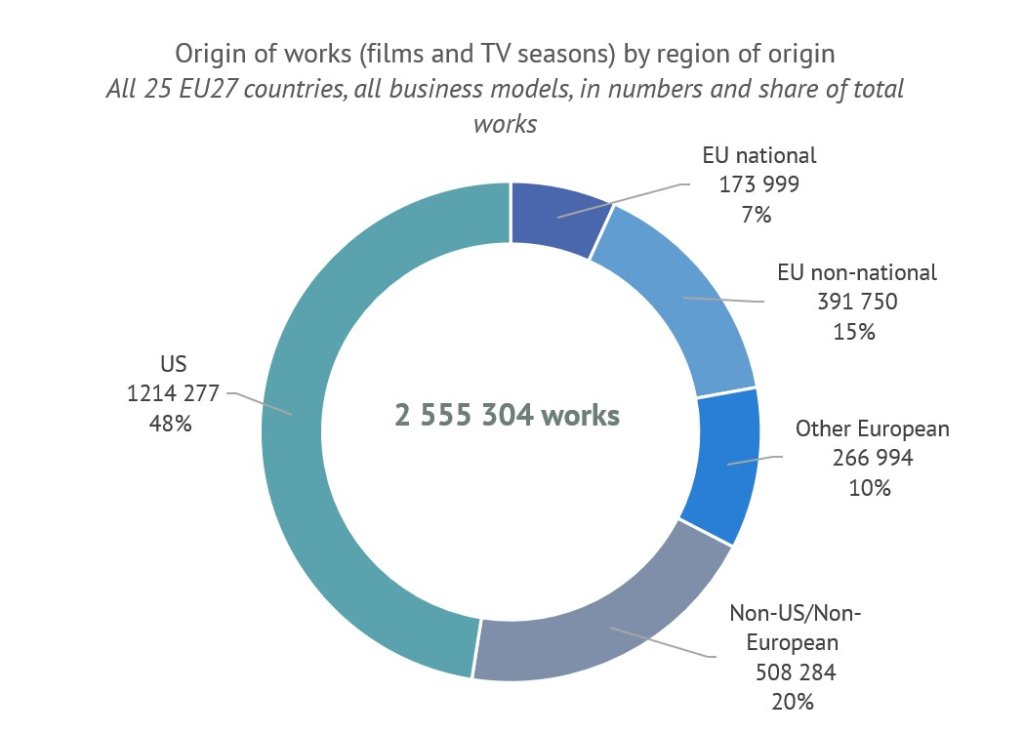 Хотя на европейские проекты приходится 46% всех наименований в VOD-каталогах, они составляют лишь 32% от общего числа «появлений» (фактического количества упоминаний произведения в различных онлайн-библиотеках).