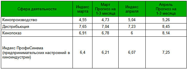 Индекс ПрофиСинема (Индекс предпринимательских настроений в киноиндустрии), отражающий оценку во всех областях киноиндустрии, в апреле несколько снизился по сравнению с мартом и составил 6,07 балла («Удовлетворительно» по десятибалльной шкале).