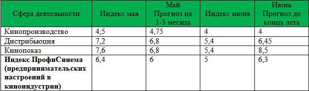 Индекс ПрофиСинема (Индекс предпринимательских настроений в киноиндустрии) в июне опять понизился по сравнению с маем и отражает оценку во всех областях киноиндустрии («Уже не плохо, но еще не удовлетворительно» по десятибалльной шкале).